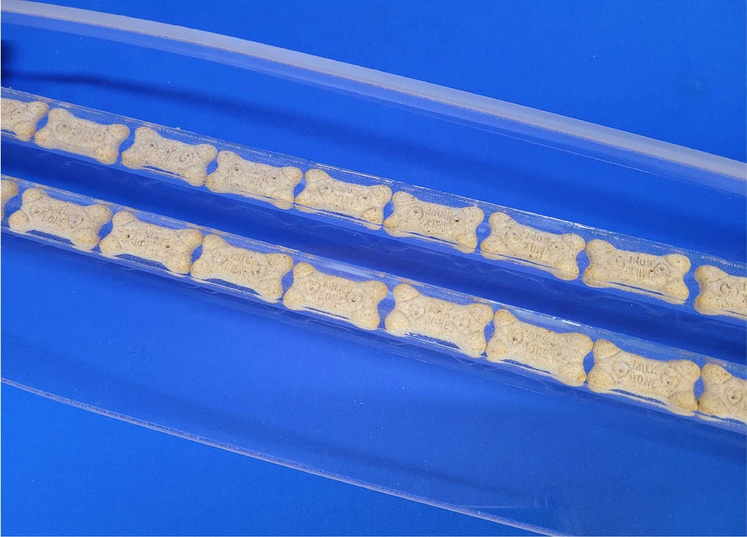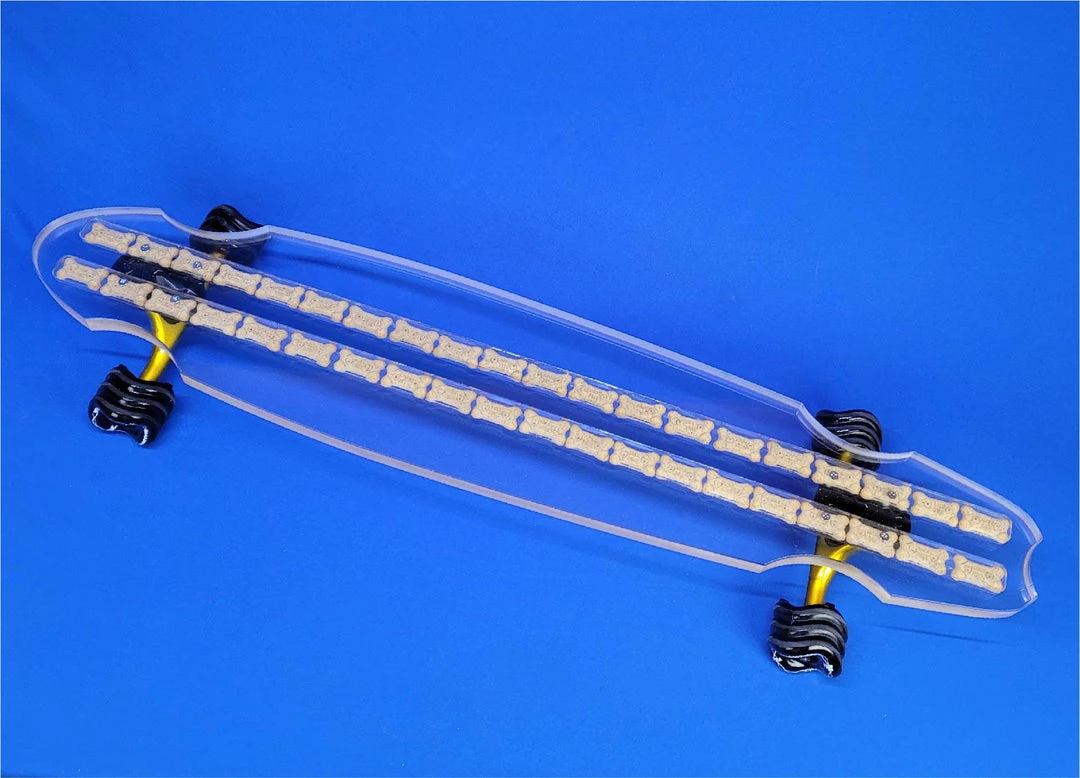 This is a one-of-a-kind 40″ Wheel Cut board with dog biscuits encapsulated in the board. Includes Metallic Gold trucks and Black Shark Wheels along with a 1″ thick deck.