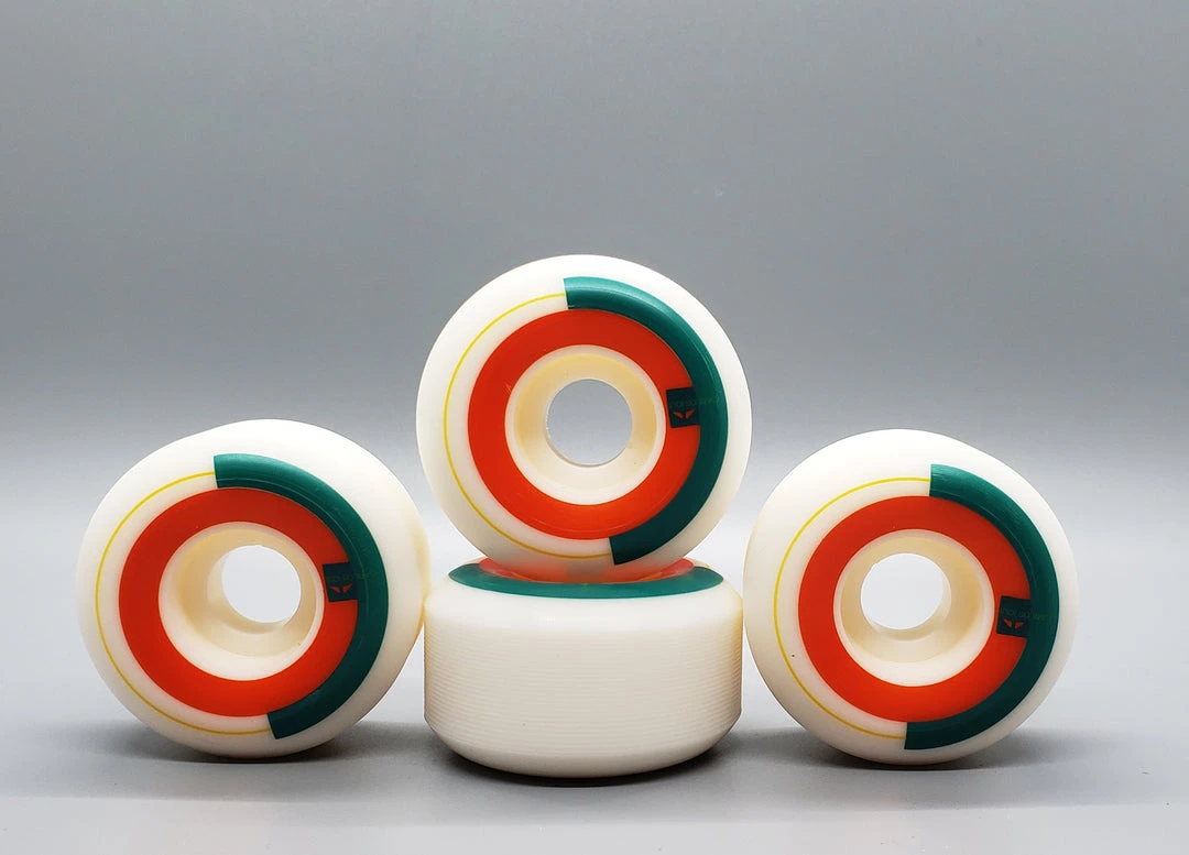 One (1) set of 52mm Crupie Wheels Carlos Iqui Cie White / Orange / Teal Skateboard Wheels – 101a; includes four (4) wheels