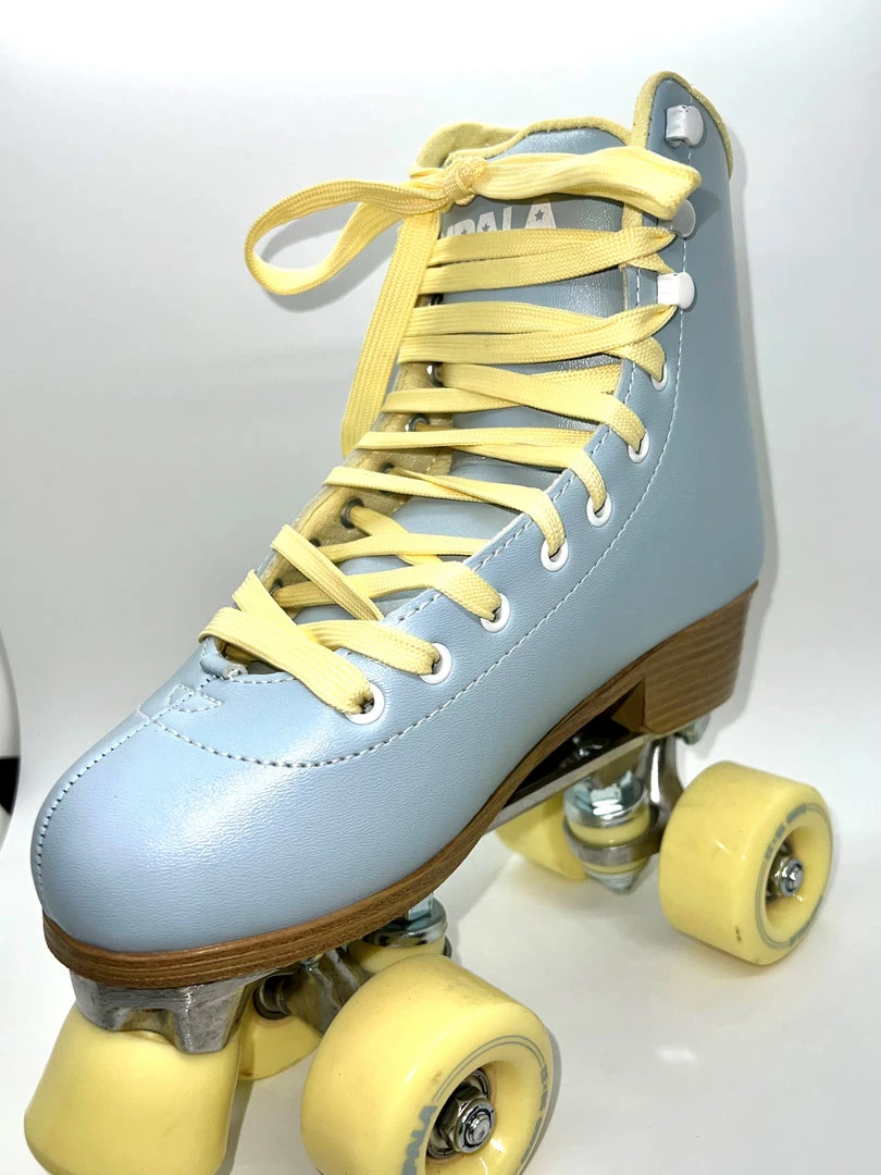 Impala Rollerskates Aqua Impala Quad Roller Skates cuz you’re drifting on a dream! These quad roller skates have PVC uppers, heels and soles, metal speed lace eyelets, aluminum alloy trucks and baseplates, 58mm 82a durometer nylon core urethane wheels, ABEC 7 bearings, and PU brake stoppers.
