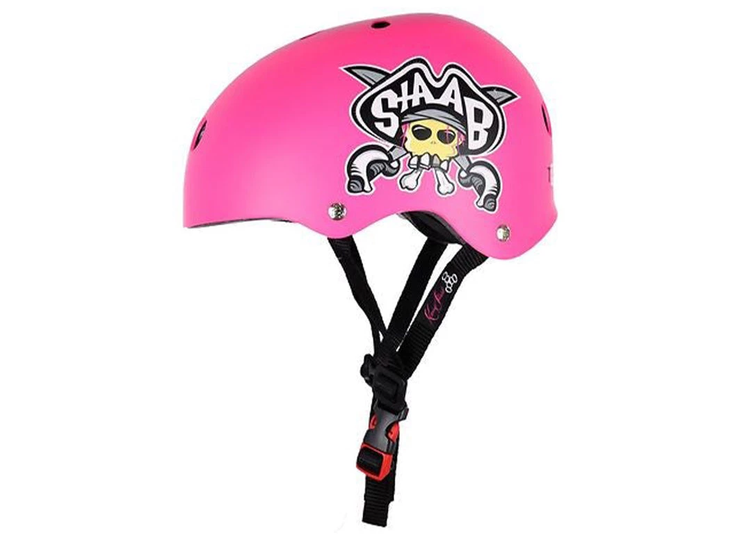 Cool Triple Eight helmet in pink with a cool pirate with sabers and the name “Staab” on the left side, which has been designed by Kevin Saab. The helmet has a white logo on the front and a colourful logo at the back.