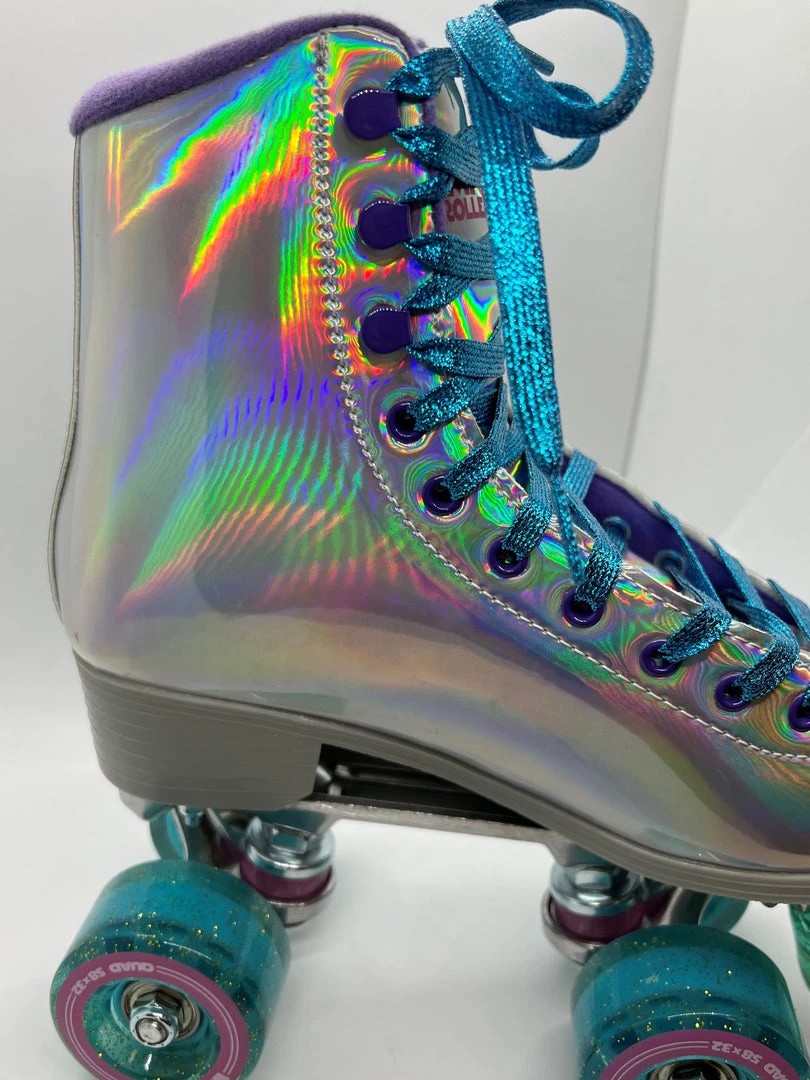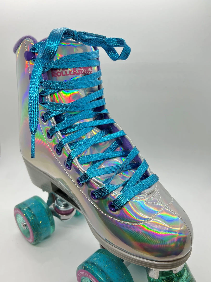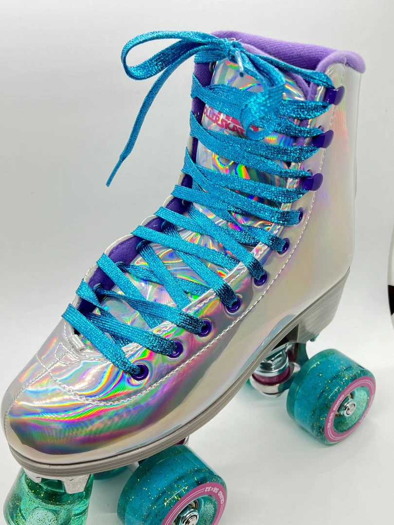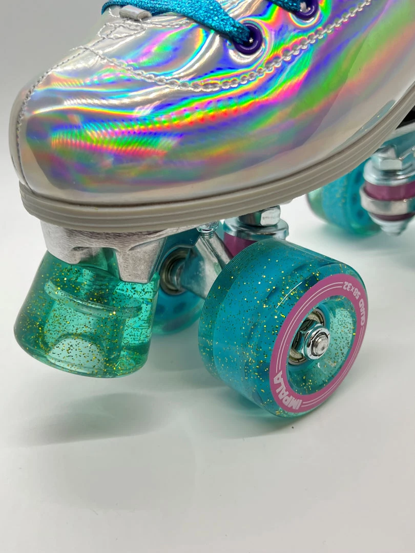 Impala Rollerskates Aqua Impala Quad Roller Skates cuz you’re drifting on a dream! These quad roller skates have PVC uppers, heels and soles, metal speed lace eyelets, aluminum alloy trucks and baseplates, 58mm 82a durometer nylon core urethane wheels, ABEC 7 bearings, and PU brake stoppers.