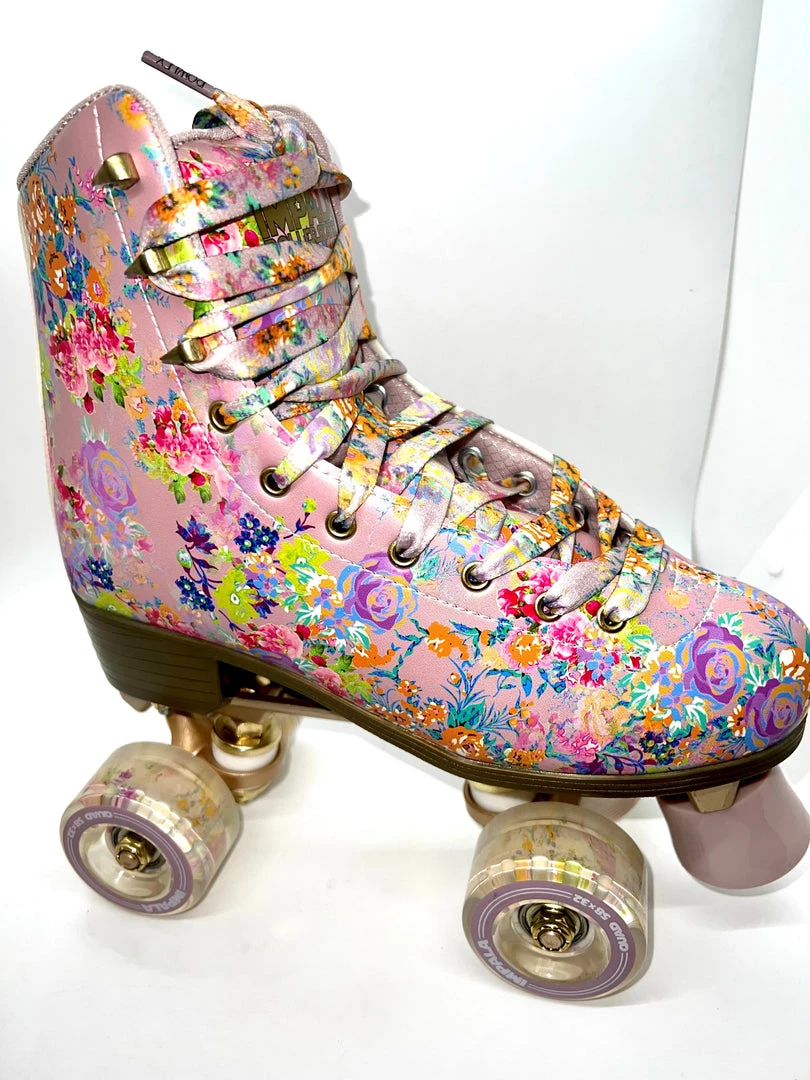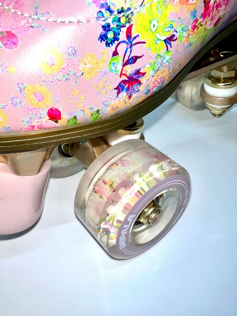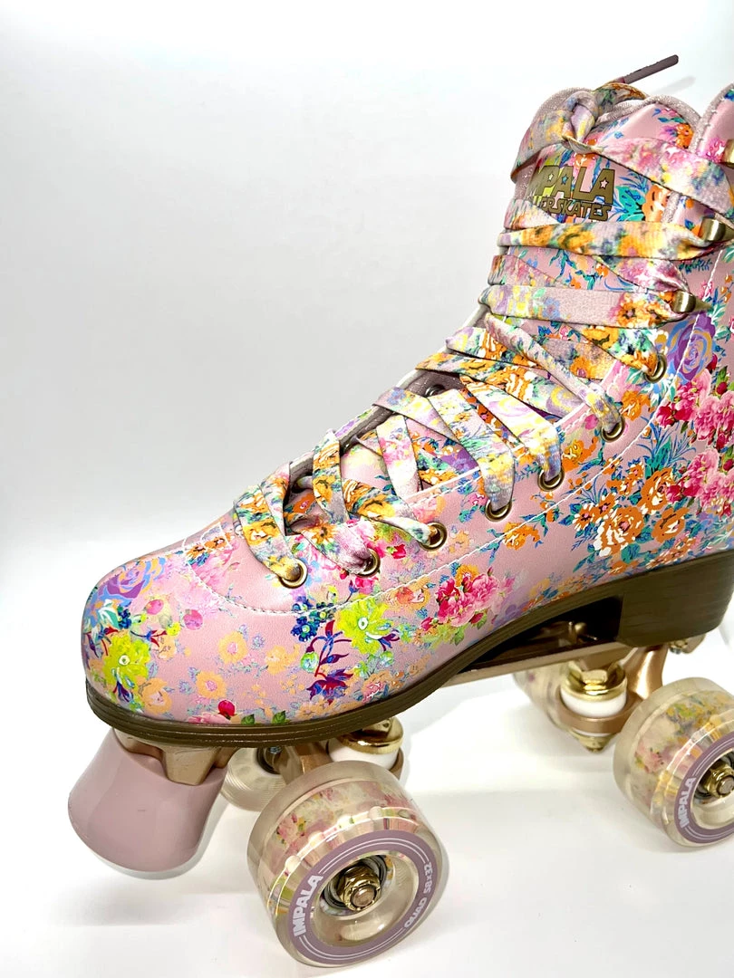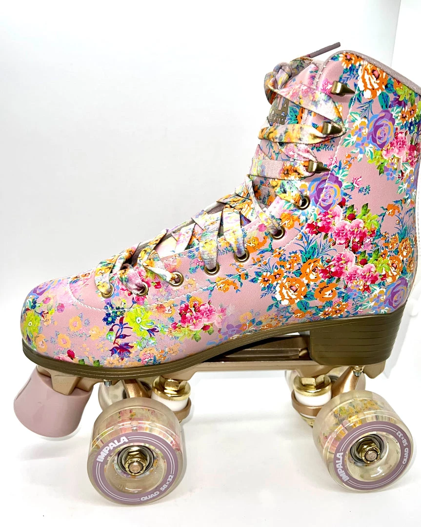Impala Rollerskates Aqua Impala Quad Roller Skates cuz you’re drifting on a dream! These quad roller skates have PVC uppers, heels and soles, metal speed lace eyelets, aluminum alloy trucks and baseplates, 58mm 82a durometer nylon core urethane wheels, ABEC 7 bearings, and PU brake stoppers.