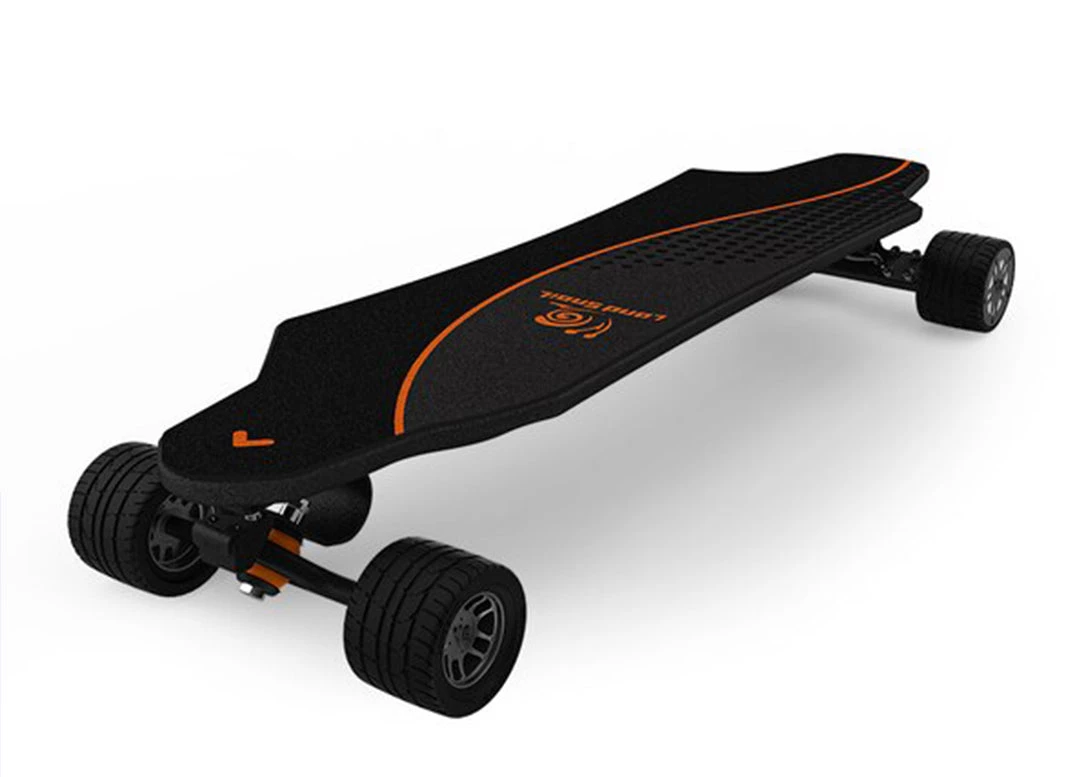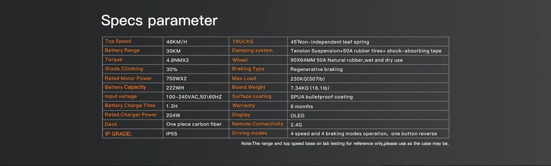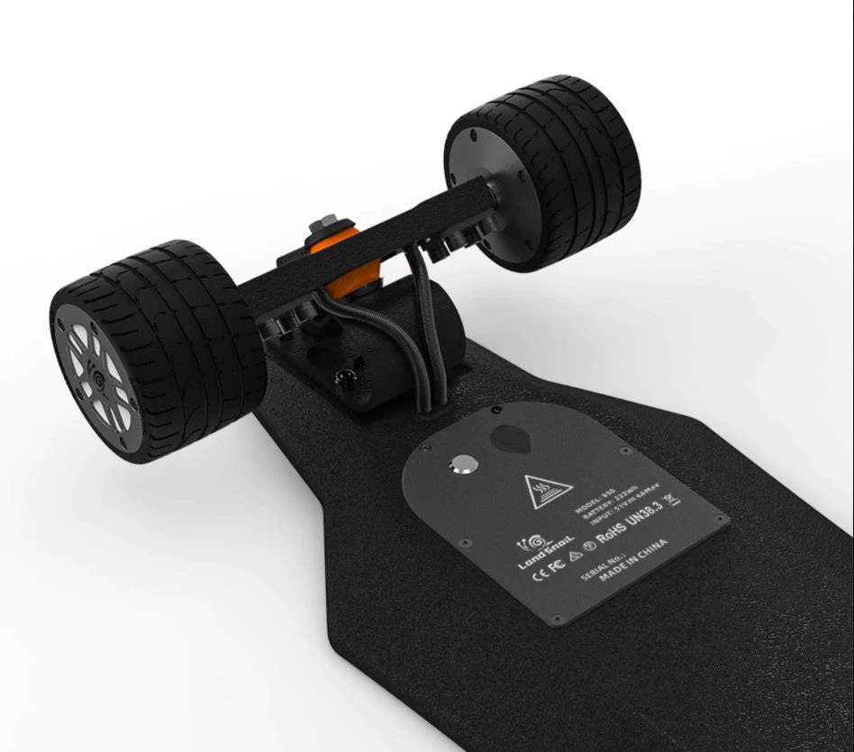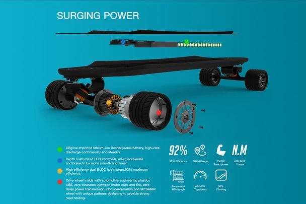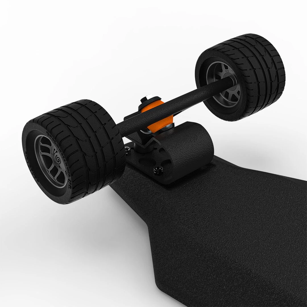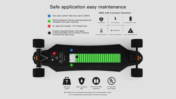 This skateboard offers precise driving with little vibration and noise. Professionally damping system with tension suspension and 50A rubber tires filtering. Stable structure shaped PU make sure the contact area when turning is constant and linear, steering feedback is accurate. A alloy steel shaft with .001 mm tolerance, heat treated, abrasion resistant corrosion stability. NSK waterproof bearing, which are dedicated for heavy load motors and maintenance free for a lifetime of use. Quick wheel replacement design and fast drainage for water which is IP55 rated. UL approved charges that charge within 1.3 hours and can handle loads up to 507lb.
